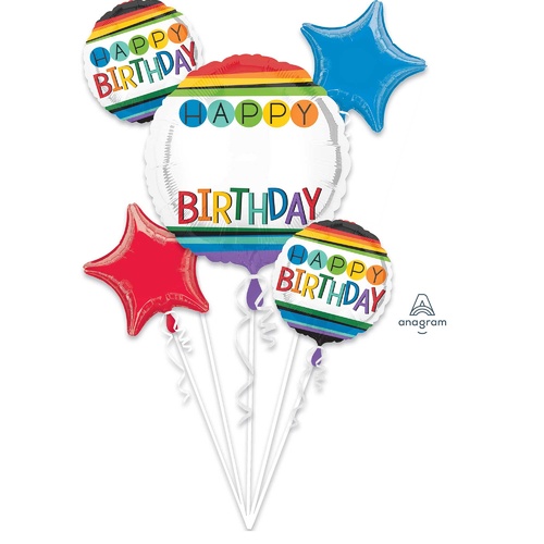 Happy Birthday Rainbow Foil Balloon Bouquet (Personalize It) (5 Balloons - 1 x SuperShape Foil, 2 x Round 45cm Foils & 2 x Printed 45cm Foils)
